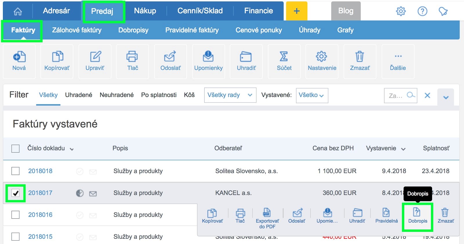 V sekcii Predaj – Faktúry si nájdite faktúru, ku ktorej chcete dobropis vystaviť a označte ju. Potom kliknite na druhú možnosť sprava – Dobropis.