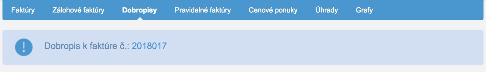 V karte dobropisu priamo vidíte, ku ktorej faktúre bol vystavený, a môžete sa na ňu priamo prekliknúť. Postup platí aj opačne – z konkrétnej faktúry sa na jedno kliknutie dostanete do príslušného dobropisu.
