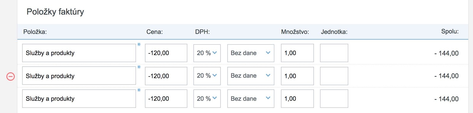 V prípade, že vystavujete dobropis k faktúre, ktorá má viac položiek, nezabudnite tie, ktorých sa celková úprava netýka, vymazať. Urobíte to tak, že kurzorom myši prejdete na položku a kliknete na symbol jednosmerky.