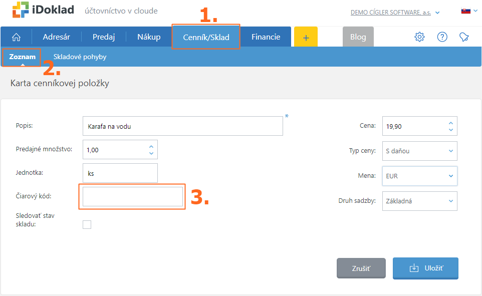 - Zvoľte v iDoklade záložku Cenník/Sklad a vyberte možnosť Zoznam.