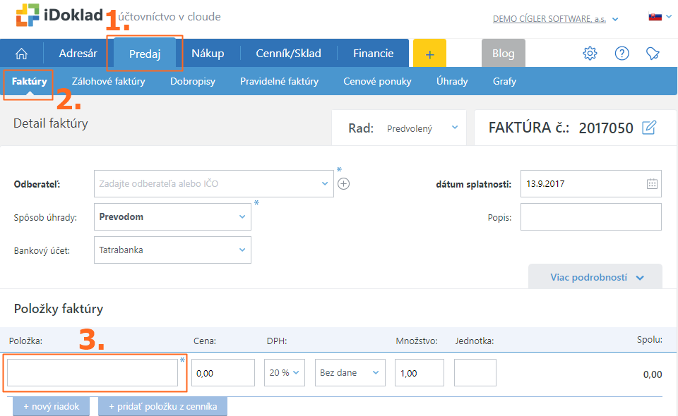 - Kliknite do políčka Položka a načítajte čiarový kód. Produkt sa Vám ihneď pridá na faktúru. Takto môžete pridať ľubovoľný počet položiek.