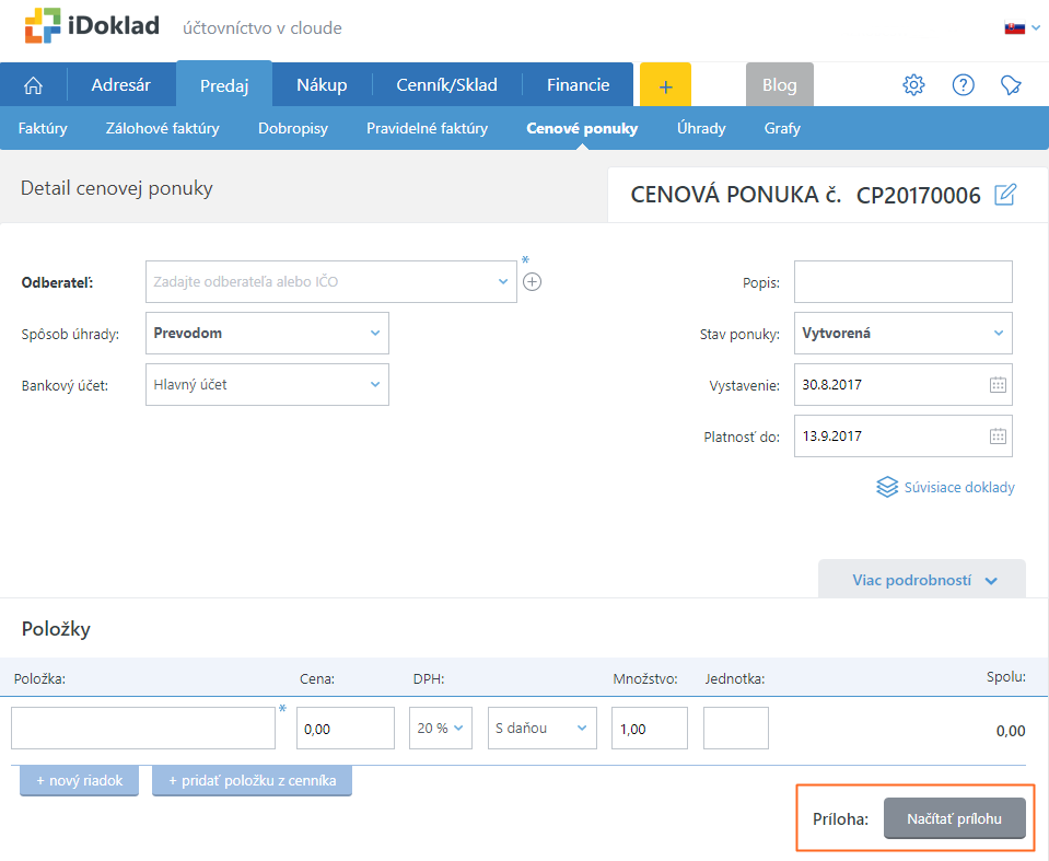 Pomocou tlačidla Načítať prílohu k cenovej ponuke odteraz pripojíte fotokópiu dokladov, dokumentov alebo ľubovoľný súbor vo formáte PNG, JPEG, JPG, PDF, ZIP, RAR, XLSX, DOCX, ODT, ODS alebo TXT. Maximálna veľkosť súbor je 1MB. Prílohu jednoducho odošlete zákazníkovi e-mailom spolu s cenovou ponukou priamo z iDokladu.