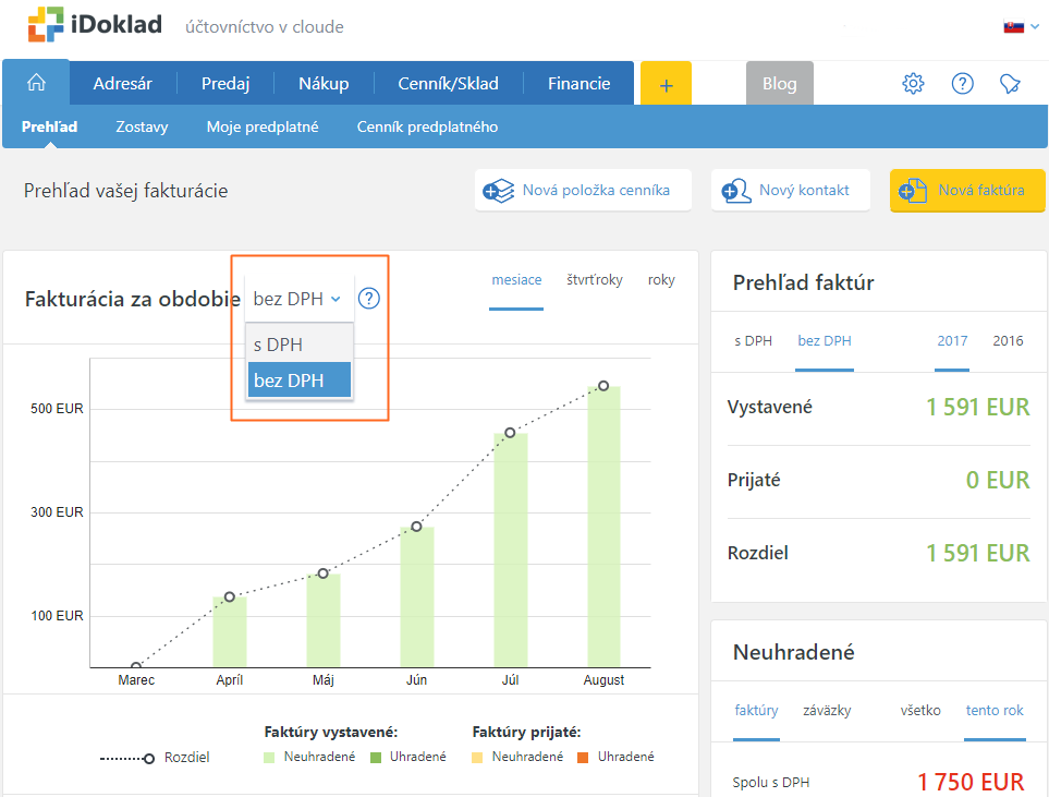 Platitelia DPH si odteraz môžu zvoliť, či chcú na domovskej stránke zobrazovať graf Fakturácie za obdobie podľa ceny S daňou alebo Bez dane. Toto nastavenie si navyše iDoklad zapamätá a pri ďalšom prihlásení už nájdete grafy také, aké ste si ich nastavili.