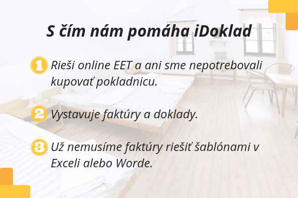 Mám rada tlač viacerých dokladov naraz. Napríklad predajok za určité obdobie alebo dokladov o prijatej platbe. Na dve kliknutia ich vytlačím aj dvadsať, nemusím otvárať každý doklad zvlášť. Vďaka iDokladu jednoducho spracujem platby a rezervácie. A o zložitejšie účtovníctvo sa nám od začiatku podnikania stará účtovnícka firma.