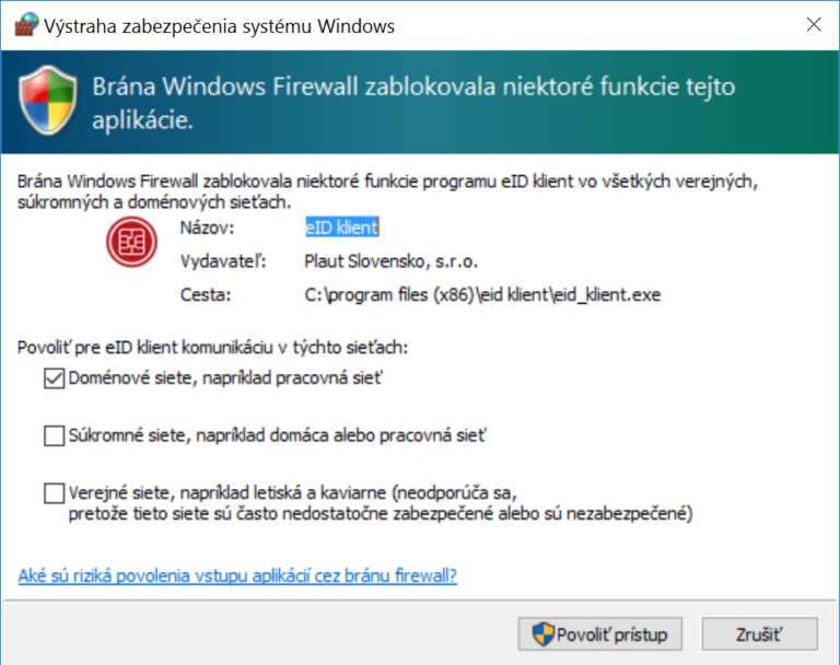 Pri prvom spustení sa pripravte na to, že možno bude potrebné povoliť komunikáciu cez firewall so stránkou slovensko.sk. Taktiež výzvu operačného systému Windows, či prípadnú antivírusovú ochranu alebo firewall iných výrobcov.