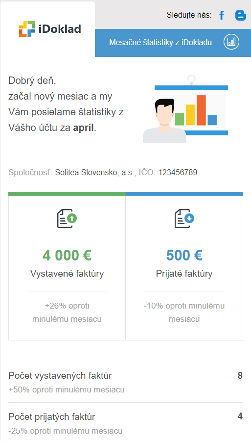 Podnikanie je nekonečný kolobeh obchodu a povinností. Popri všetkých úlohách a stretnutiach, ktoré musia živnostníci aj majitelia firiem riešiť, často strácajú prehľad o svojich faktúrach. A na to je tu nová služba iDokladu – pravidelný mesačný e-mail, ktorý sleduje vývoj za Vás. Prečítajte si, s čím všetkým Vám pomôže.