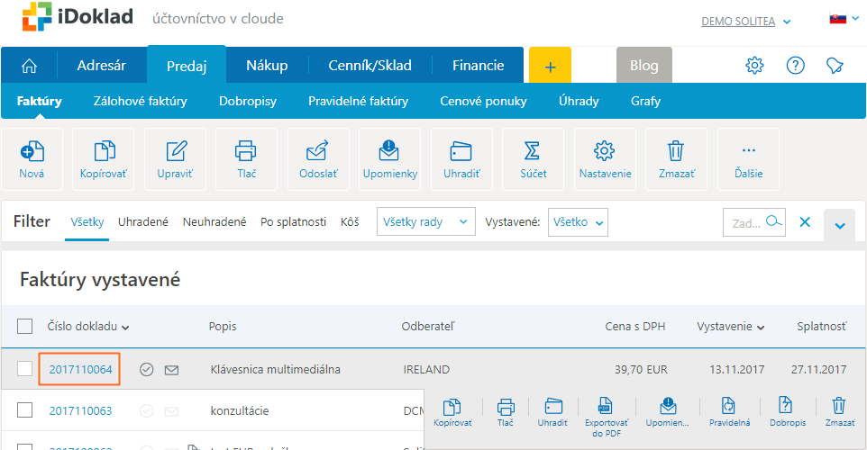 Zvoľte záložku Predaj a vyberte možnosť Faktúry. Konkrétnu faktúru otvoríte tým, že kliknete na jej modré číslo.