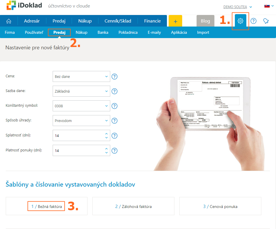Zvoľte záložku Nastavenia (ozubené koliesko na hornej lište stránky) a zvoľte záložku Predaj. V druhej sekcii Šablóny a číslovanie vystavovaných dokladov zvoľte Bežnú faktúru (rovnakým postupom nastavíte zmenu jazyka aj pri Zálohovej faktúre).