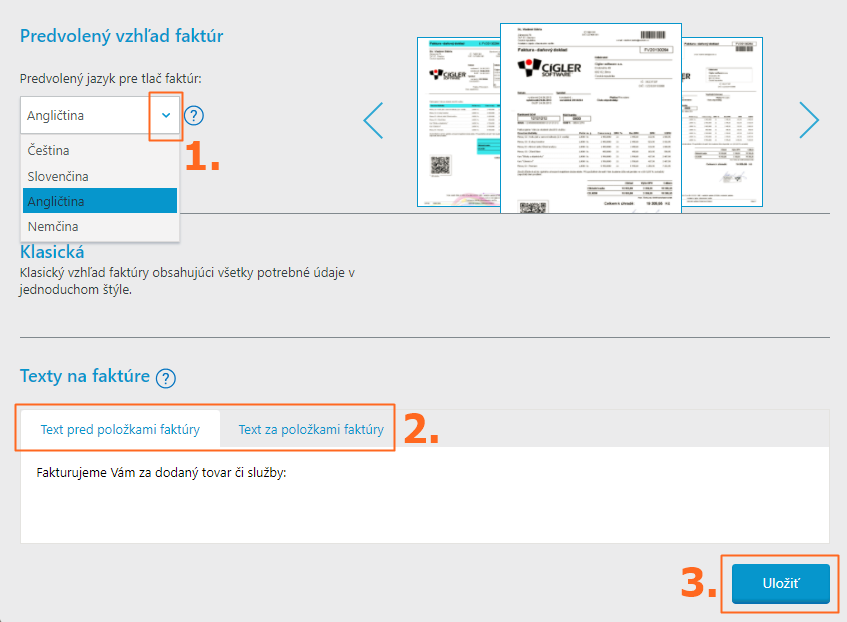 Ďalší postup je rovnaký ako v prípade predchádzajúceho nastavenia. Rozbalením menu zvolíte požadovaný jazyk faktúr, zmeníte prípadne aj text pred a za položkami faktúry a nastavenia Uložíte.