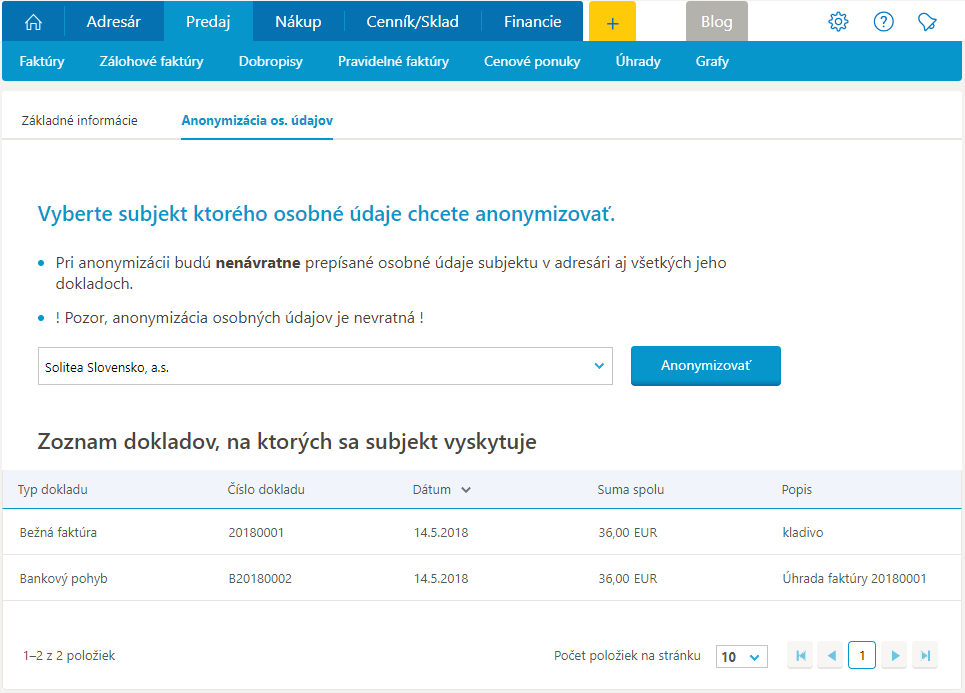 • Všetky osobné údaje dotknutej osoby (v adresári aj na dokladoch) môžete anonymizovať.