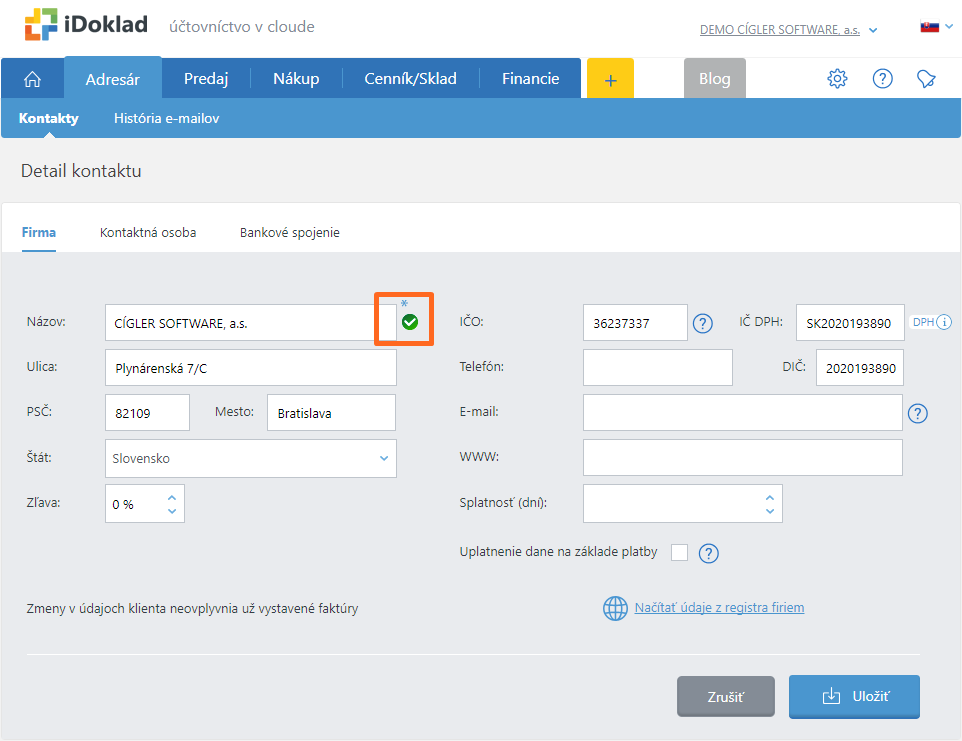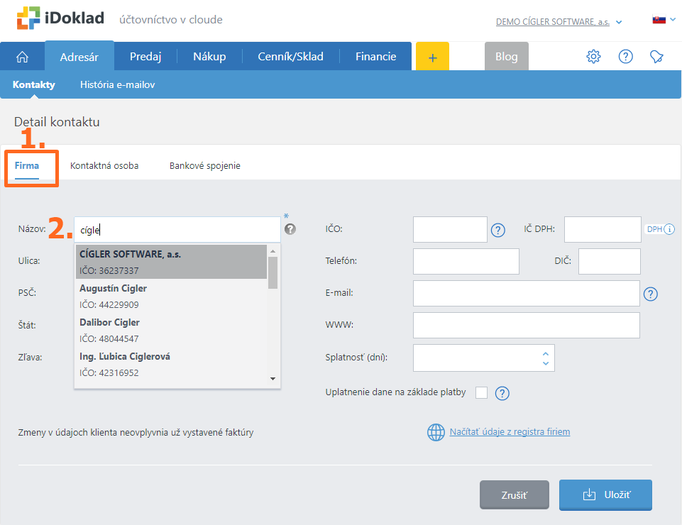 3.Detailoch kontaktu stačí vyplniť prvú záložku Firma. Je to jednoduché – iDoklad si sám sťahuje údaje z registra firiem (zdroj: Štatistický úrad). Stačí vyplniť prvé tri písmená z názvu a pomocou našepkávača vybrať klienta.