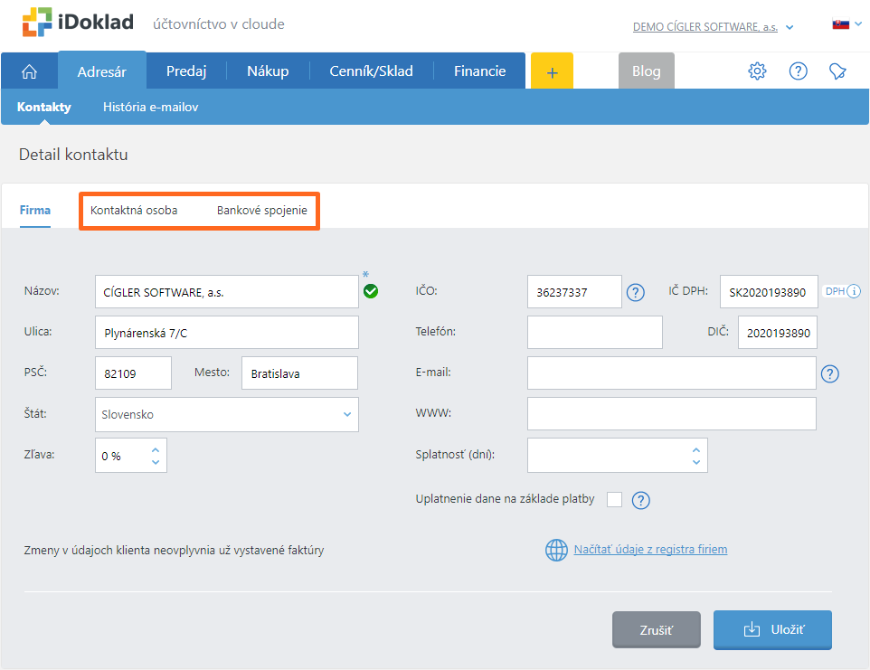 Kontaktná osoba a Bankové spojenie v adresári iDoklad