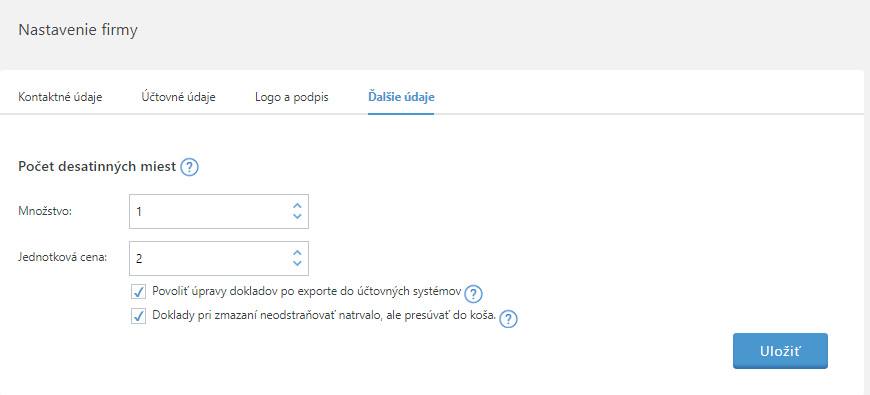 Ako posledné je v menu záložka Ďalšie údaje. Tu si nastavíte možnosti, ktoré sa týkajú desatinných miest pri množstve a cene tovaru na faktúre.