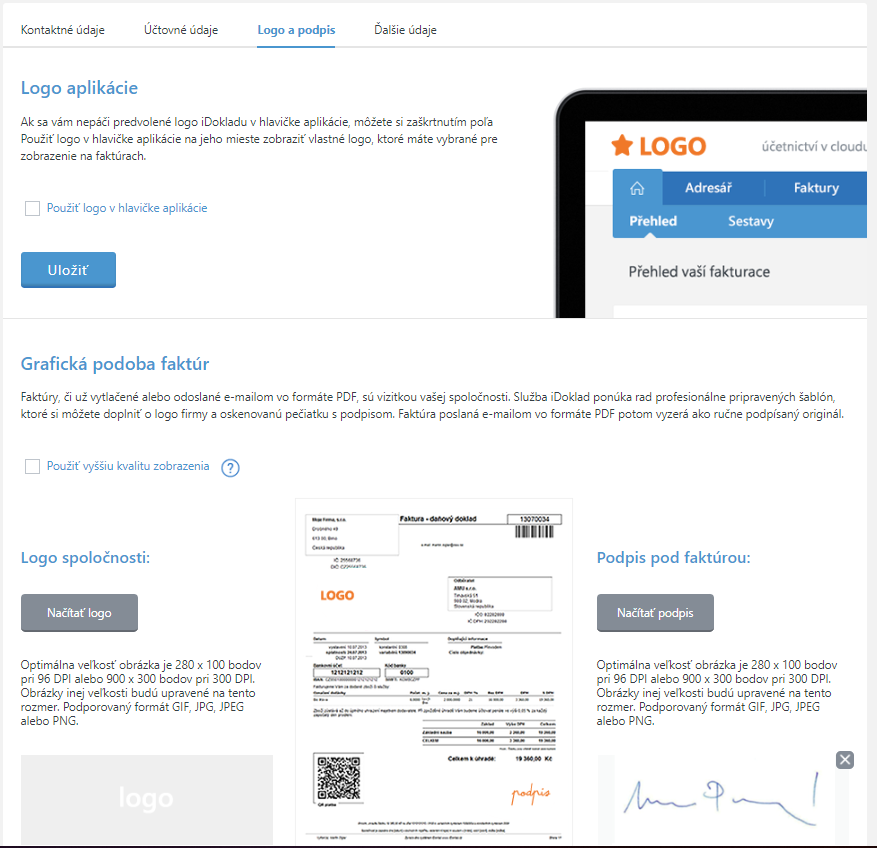 Logo a podpis na faktúru (napríklad s pečiatkou) nahráte nižšie. Stačí kliknúť na Načítať logo, Načítať podpis a nahrať príslušné súbory vo formátoch GIF, JPG, JPEG alebo PNG. Optimálny formát je 280 × 100 px.