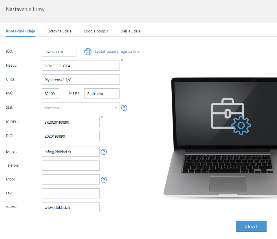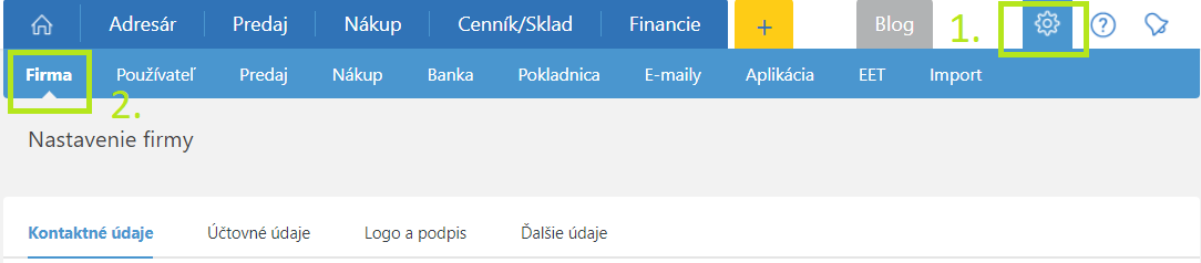 Nastavenie nájdete v pravom rohu pod ikonou ozubeného kolieska. Kliknite na prvú záložku Firma a otvoria sa vám Kontaktné údaje.