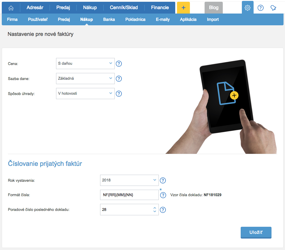 Táto sekcia Nastavení slúži ako prehľad o evidencii nákladových faktúr. Tieto faktúry okrem účtovníka nikomu neposielate, takže nemusíte nič dlho nastavovať. Najdôležitejšie je, podobne ako pri Predaji, nastavenie zrozumiteľného číselného radu pre váš prehľad.