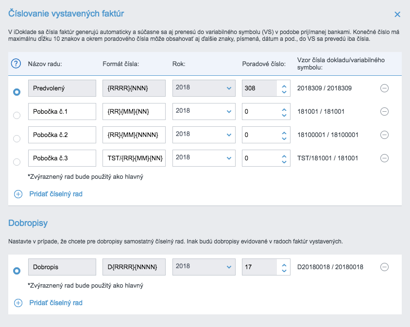 Dobropisy v základnom nastavení majú totožný číselný rad s vystavenými faktúrami, ale môžete si pre ne nastaviť aj samostatný rad.