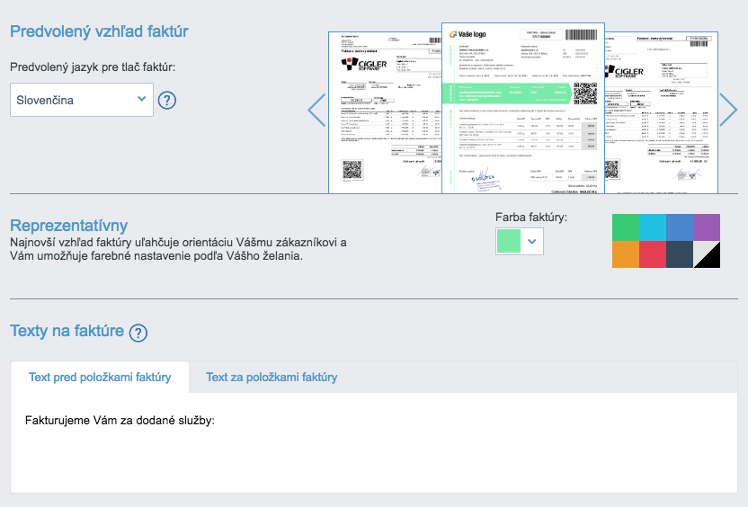 V sekcii Predvolený vzhľad faktúr zvoľte jazyky a grafické spracovanie faktúry. Vzhľad faktúry odporúčame Reprezentatívny. Vzhľad môžete vždy zmeniť na aktuálne vystavovanej faktúre v záložke Viac podrobností.