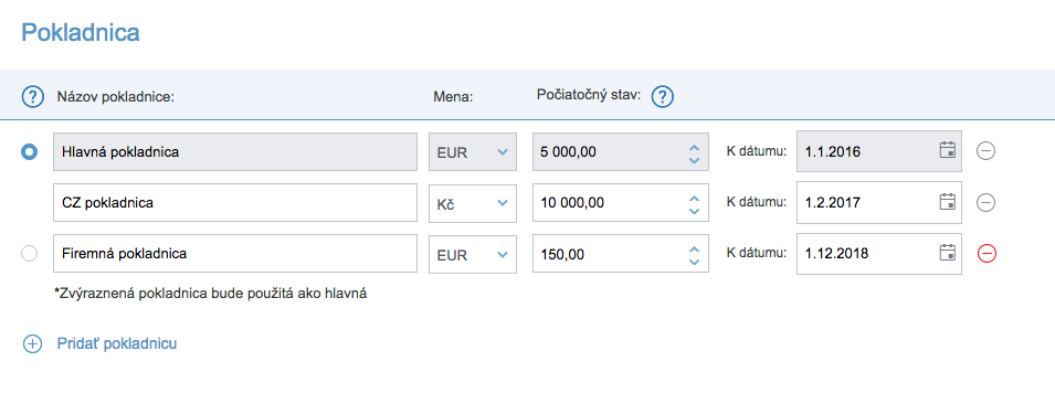Podobne ako v sekcii Banka nastavujete jednotlivé bankové účty, v Pokladnici môžete vyplniť viac pokladníc (ak využívate Obľúbené alebo Prémiové predplatné), ktoré bude iDoklad používať. Napríklad pre platby v iných menách alebo pre rôzne pobočky.