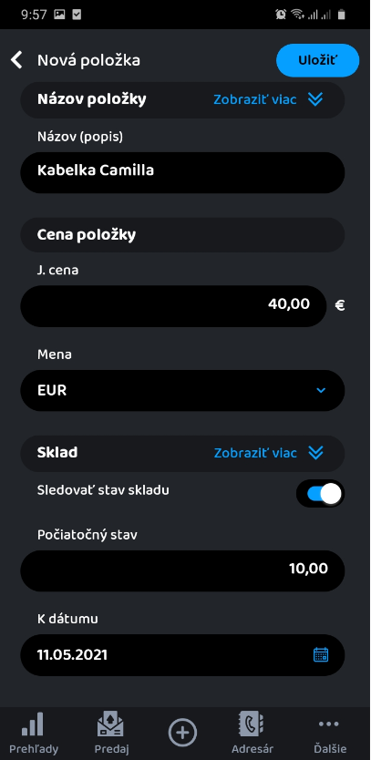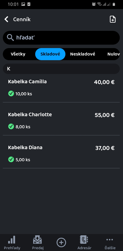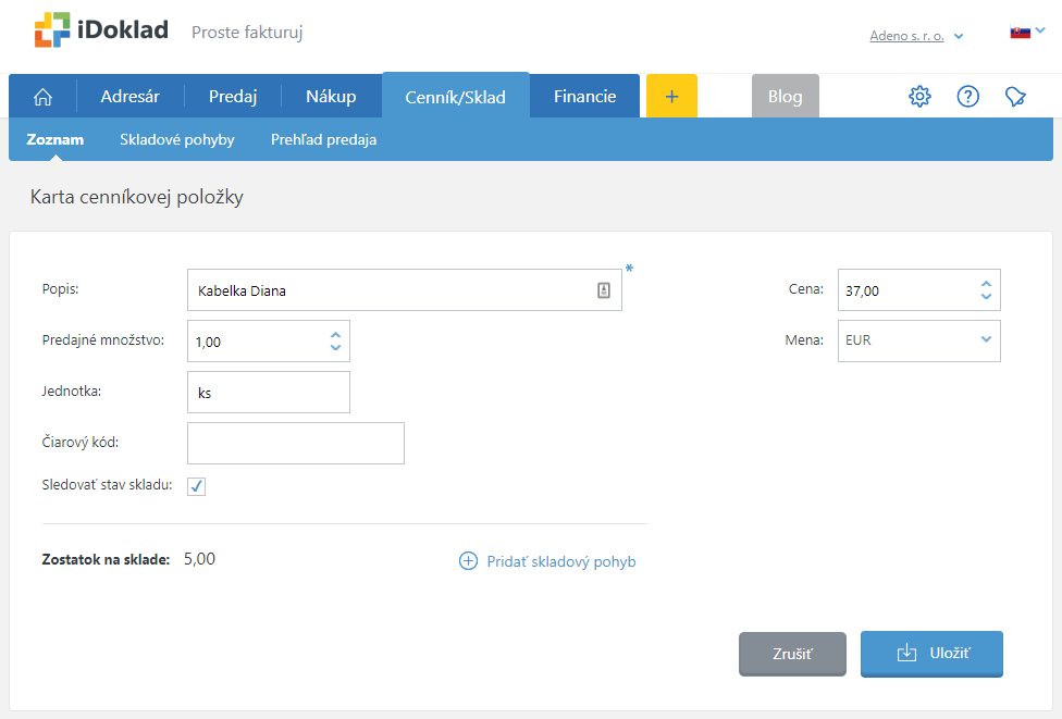 Predstavte si, že navrhujete a šijete kabelky. Máte päť modelov a z každého vždy našijete desať kusov do zásoby. Keď si do cenníka pridávate konkrétne modely kabeliek, zvoľte si, že chcete sledovať stav skladu. Následne zadáte, koľko kusov máte aktuálne na sklade.