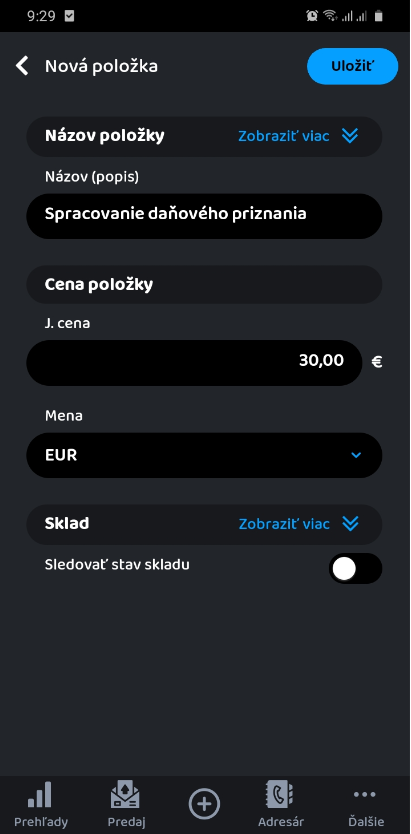 Vyplňte jej názov a jednotkovú cenu. Potom hore kliknite na modré tlačidlo Uložiť.