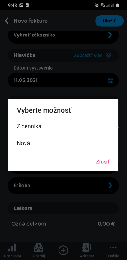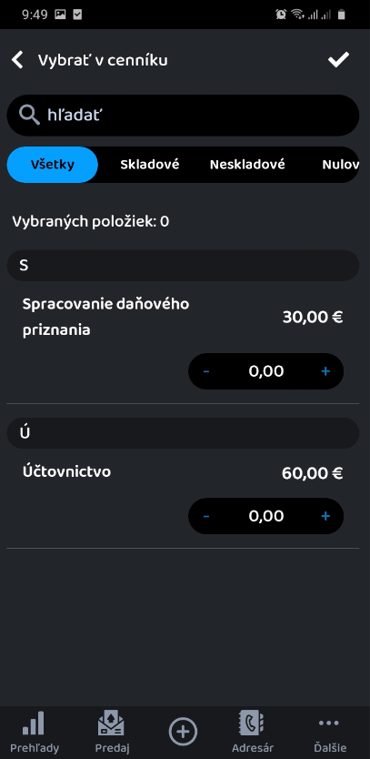 Kliknite na možnosť Z cenníka a zobrazia sa vám všetky položky, ktoré v ňom máte uložené. Zvolíte tú správnu a zadáte množstvo. Výber potvrdíte fajkou v pravom hornom rohu.