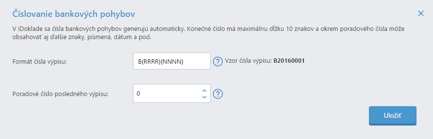 - Odkaz Nastavenie číslovania bankových pohybov otvorí okno, kde si môžete určiť formát číselného radu pre označenie bankových výpisov.