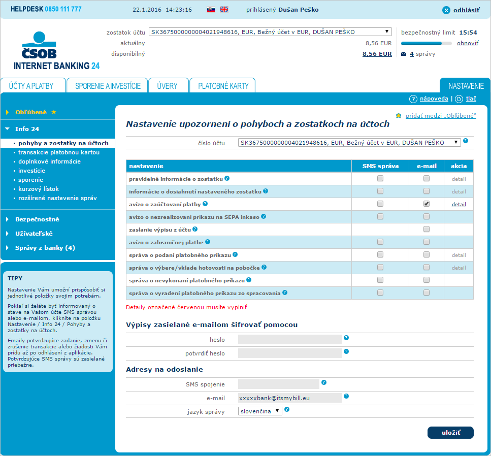 - Zasielanie informácii o pohyboch na účte nájdete v záložke Nastavenie v ľavom menu cez položku Info 24/Pohyby a zostatky na účtoch. Pre odosielanie informácií o každom pohybe na účte zaškrtnite pole E-mail na riadku Avízo o zaúčtovaní platby.