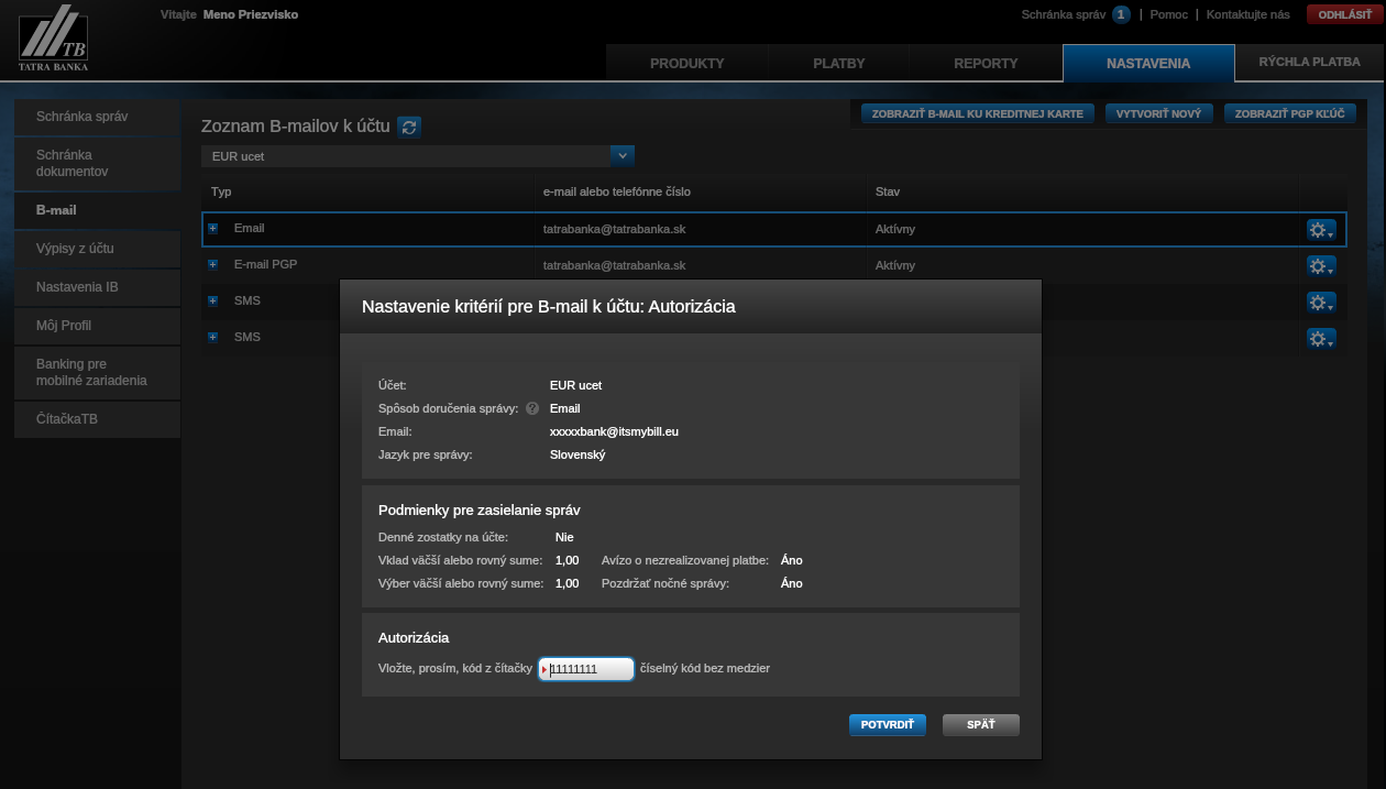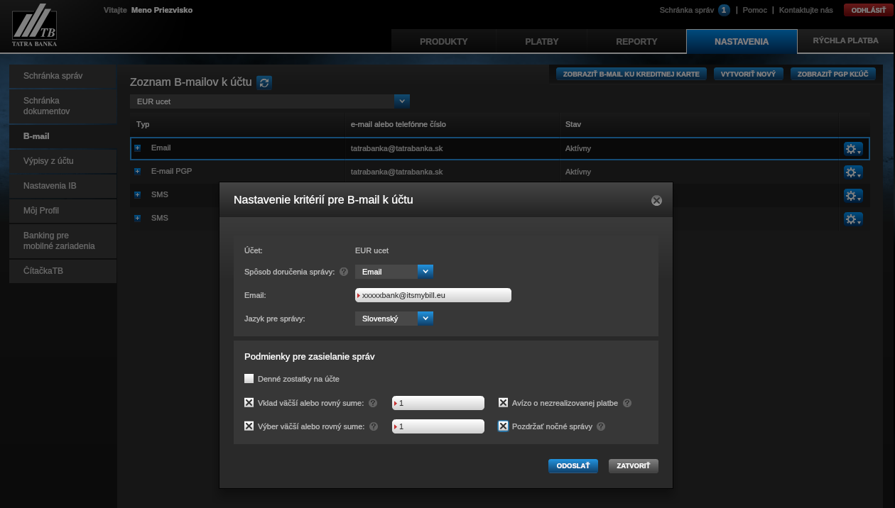 Zasielanie notifikačných e-mailov v Internet bankingu Tatrabanky si nastavíte veľmi jednoducho na jednej záložke. Treba však mať aktivovanú službu b-mail, ktorá Vám doručí informácie o pohyboch na účte.