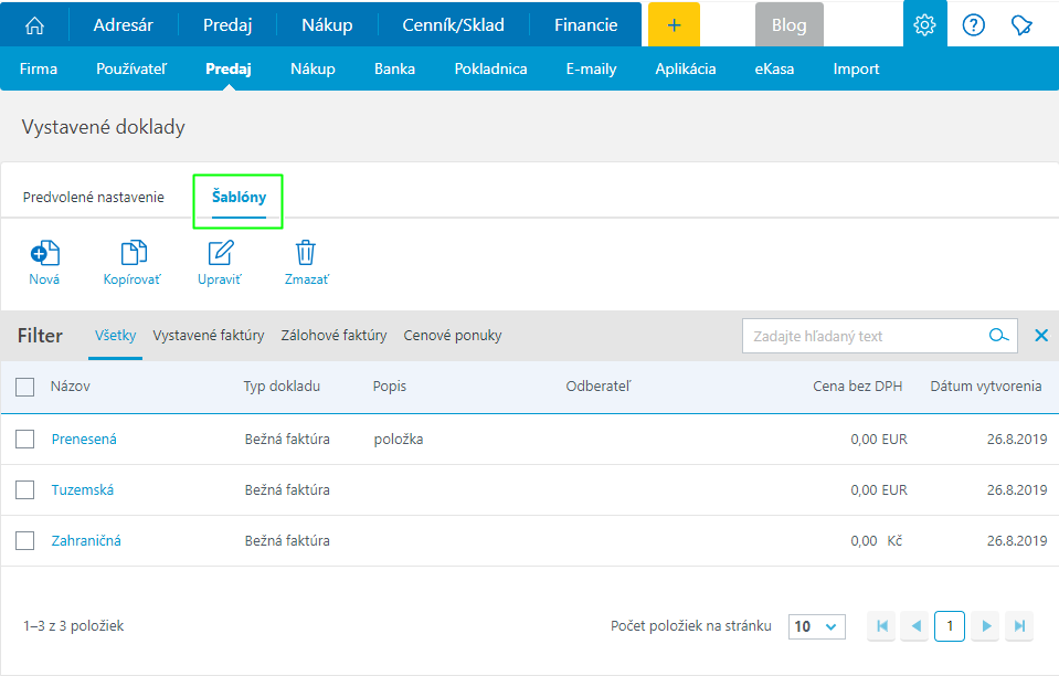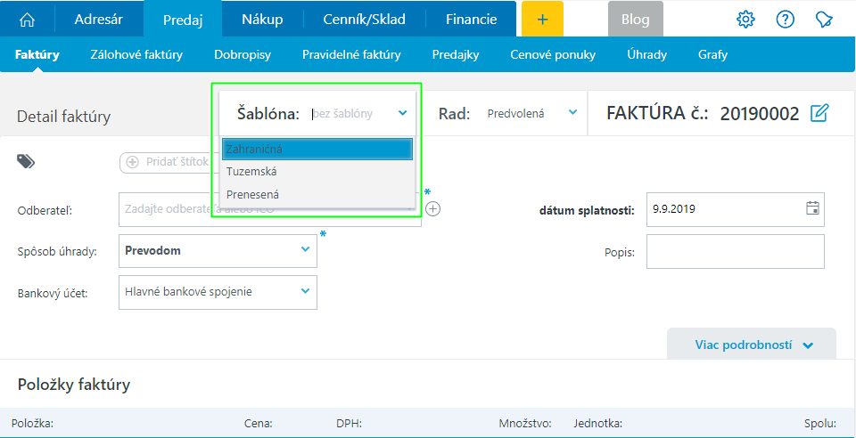 Tak, ako ste zvyknutí zvoľte vystavenie novej faktúry. V jej detaile potom nájdete vedľa číselného radu rolovaciu ponuku s názvom Šablóna. Po kliknutí vám vyjde ponuka s prednastavenými dokladmi. Napríklad Zahraničné faktúry alebo Prenesená daňová povinnosť. Je iba na vás, ako si šablóny nazvete.