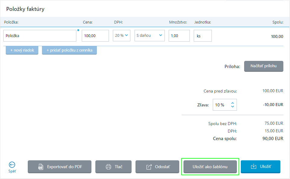 Šablónu vytvoríte aj z už existujúcej faktúry. V detaile vystavenej faktúry, zálohovej faktúry alebo cenovej ponuky kliknite na Uložiť ako šablónu. Šablóny vytvoríte k vystavenej faktúre, zálohovej faktúre aj cenovej ponuke.