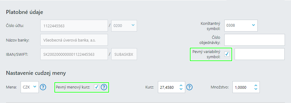 • Keď vystavujete doklad v cudzej mene s pevným kurzom. Na šablóne nastavíte cudziu menu, zaškrtnete možnosť Pevný kurz a zadáte ho do zobrazeného poľa.