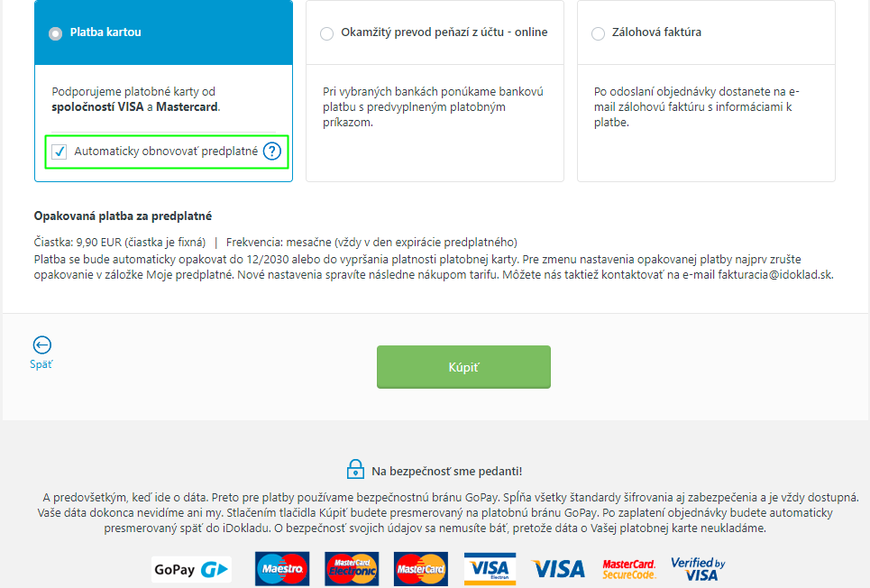 Ak chcete zmeniť predplatné, nechajte pri novom nákupe tlačidlo Opakovanie zaškrtnuté systém si zapamätá novú platbu v zadanej dĺžke trvania a bude ju opakovať. Ak necháte tlačidlo pri platbe nezaškrtnuté, žiadna ďalšia platba už sa vám z karty nestrhne. Platby sa prestanú opakovať aj v momente, keď zvolíte iný druh platby než kartou.