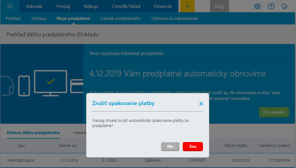 Opakovanie platby kartou je možné samozrejme kedykoľvek zrušiť na záložke Moje predplatné vo vašom iDoklade.