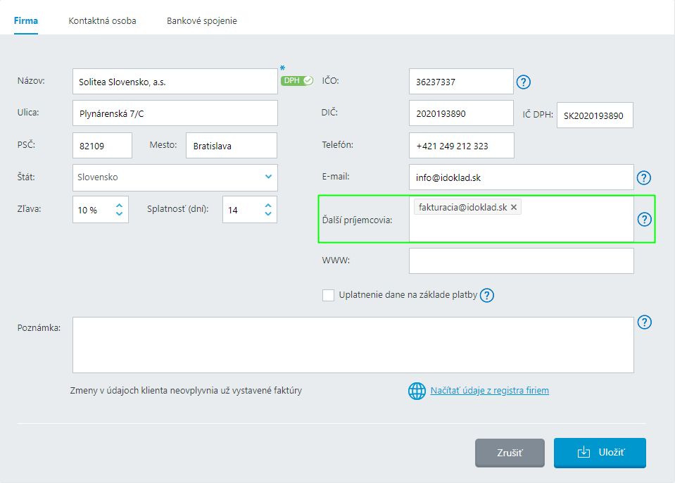 Odosielate faktúry majiteľovi firmy, no zároveň ich potrebuje vidieť vedúci skladu a účtovník? Odteraz si v adresári pri políčku „Ďalší príjemcovia“ môžete nastaviť viac e-mailov, na ktoré sa budú vaše faktúry odosielať.