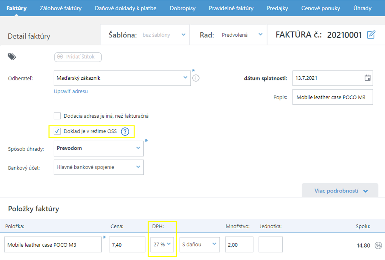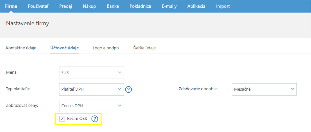 Pri vystavovaní faktúry je OSS režim nastavený automaticky – checkbox Doklad je v režime OSS.