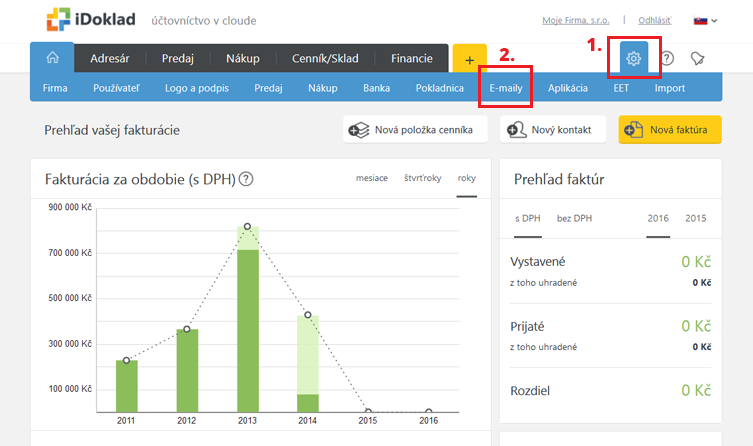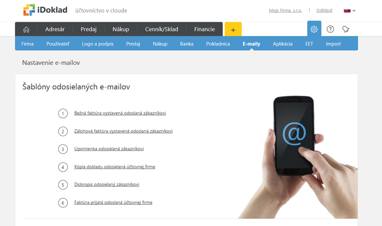 1. V iDoklade kliknite na ikonku „Nastavenie“ (ozubené kolečko v pravej časti hornej lišty) a zvoľte záložku „E-maily„.