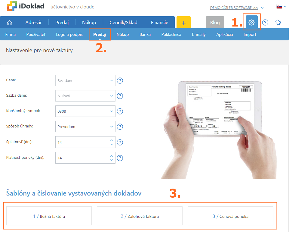 Ak ste doteraz žiadne personalizované faktúry nenastavovali, vytvárali ste faktúry len podľa šablóny. Pre nastavenie iného vzhľadu zvoľte v základnom menu ikonu Nastavenia (ozubené koliesko v pravom hornom rohu) a vyberte záložku Predaj.