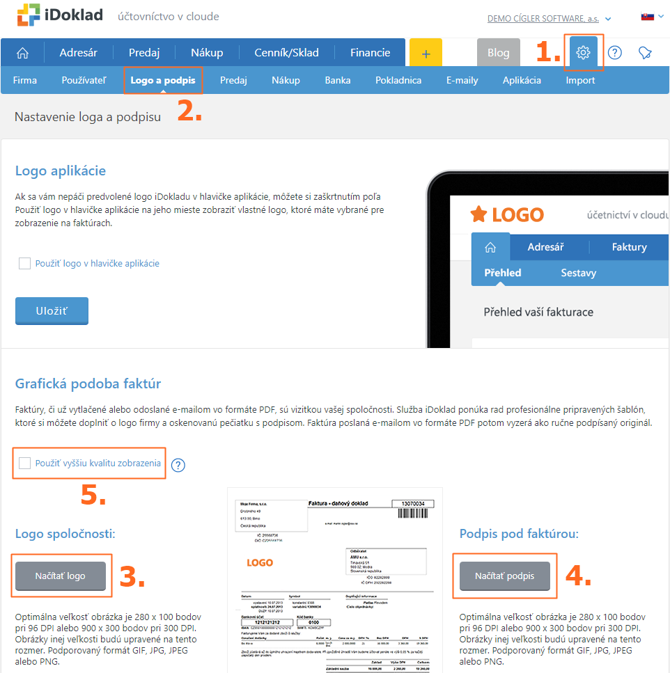 Na faktúry iDoklad umožňuje pridávať podpis a logo. Na hornej lište kliknite na ikonu ozubeného kolieska (Nastavenia) a vyberte záložku Logo a podpis.