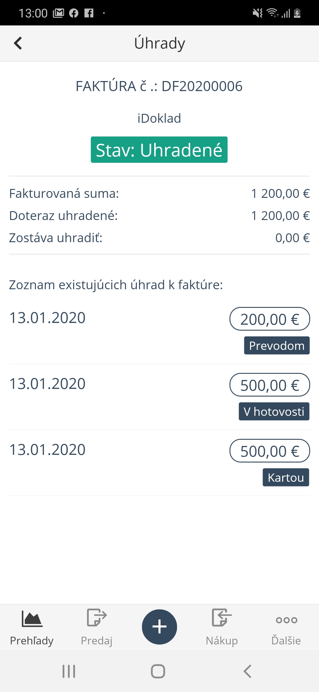 Ďalšou novinkou v mobilnej aplikácii je prehľad úhrad prijatých faktúr. Ku všetkým faktúram, ktoré si totiž do iDokladu pridáte, ľahko zadáte úhradu. Jednotlivé platby sa vám potom zobrazujú podľa časovej postupnosti.