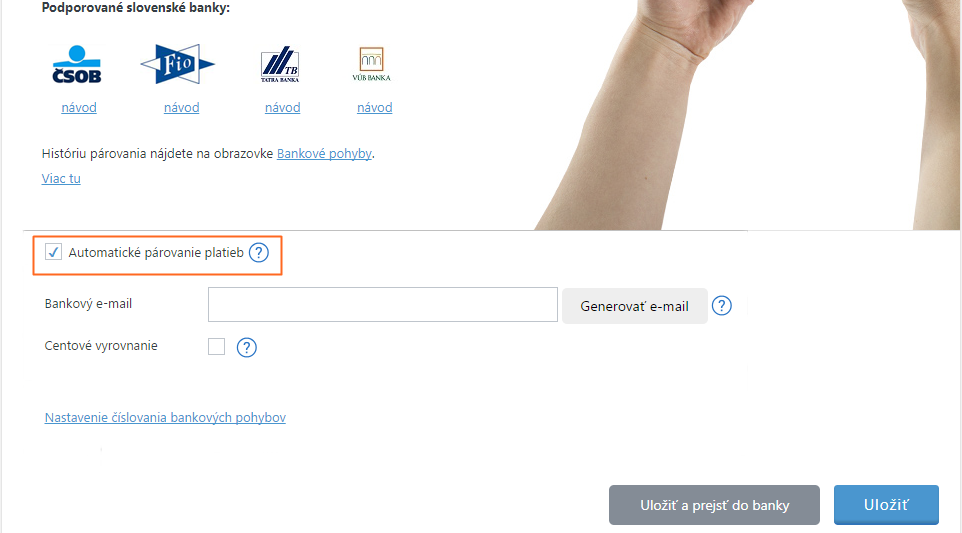 - V spodnej časti stránky zaškrtnite možnosť Automatické párovanie platieb. Potom sa vám ukáže ďalšia ponuka.