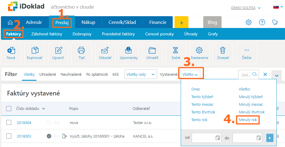Zoznam faktúr vystavených za minulý rok z iDoklad.sk