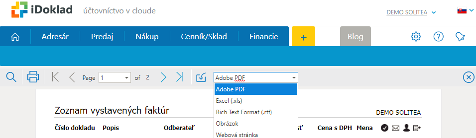 Objaví sa Vám zoznam všetkých faktúr za rok 2017. Vytlačiť si môžete vždy jednu stranu s 20 faktúrami – zaškrtnite štvorček vedľa textu Číslo dokladu a označia sa Vám všetky faktúry. Potom už len v hornej lište zvoľte Tlač a vyberte Bežná faktúra. Môžete si taktiež vytlačiť alebo poslať napríklad Pokladničné doklady.