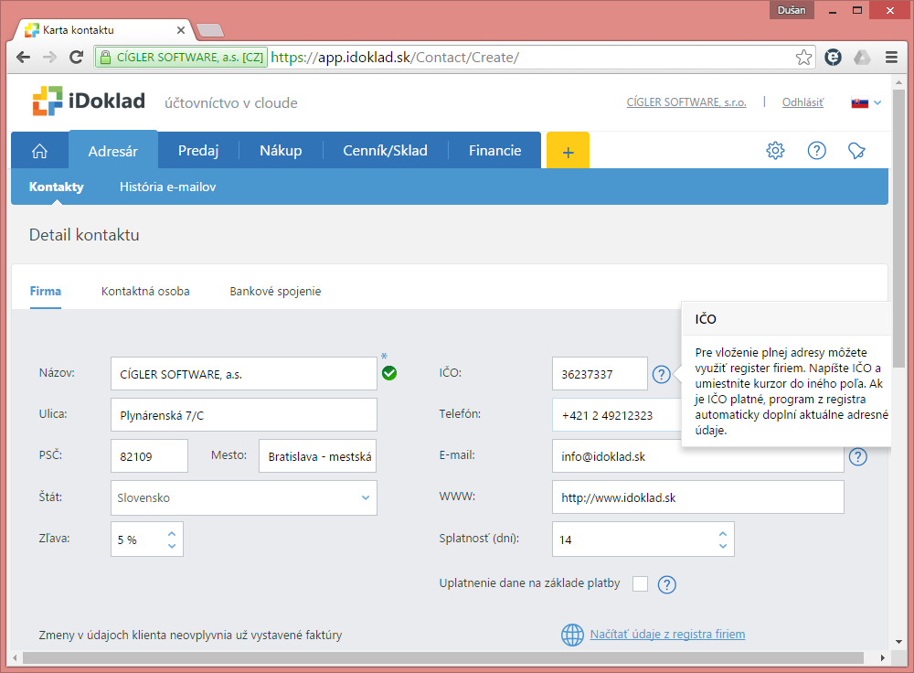 iDoklad disponuje adresami firiem (zdrojom je Štatistický úrad SR), ktoré sú pravidelne dopĺňané a aktualizované a tieto adresy Vám ponúka pri práci s kontaktami.