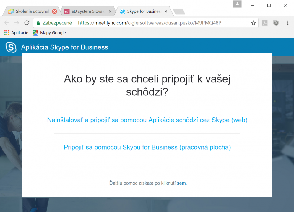 Ku pripojeniu sa k webináru nepotrebujete Skype for Business, môžete sa pripojiť aj priamo cez Váš internetový prehliadač: