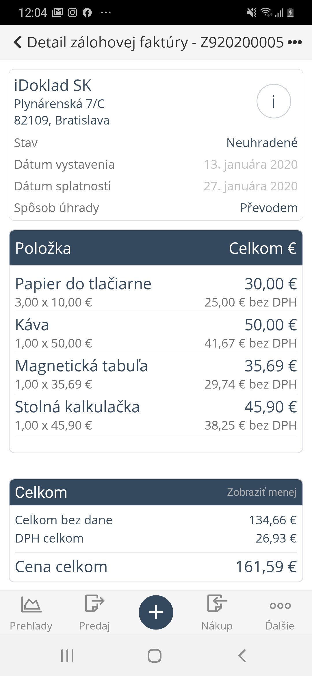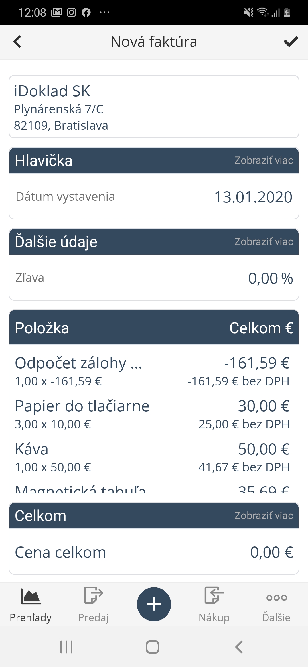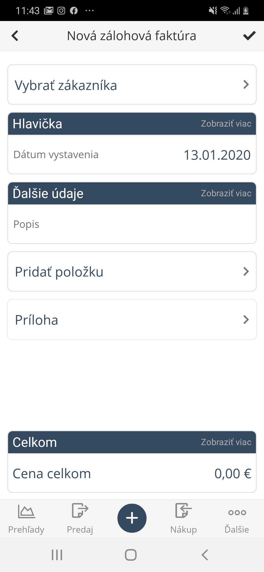 Stlačením tlačidla ✔️ v pravom hornom rohu displeja faktúru uložíte a potom ju nájdete v zozname Faktúry zálohové.