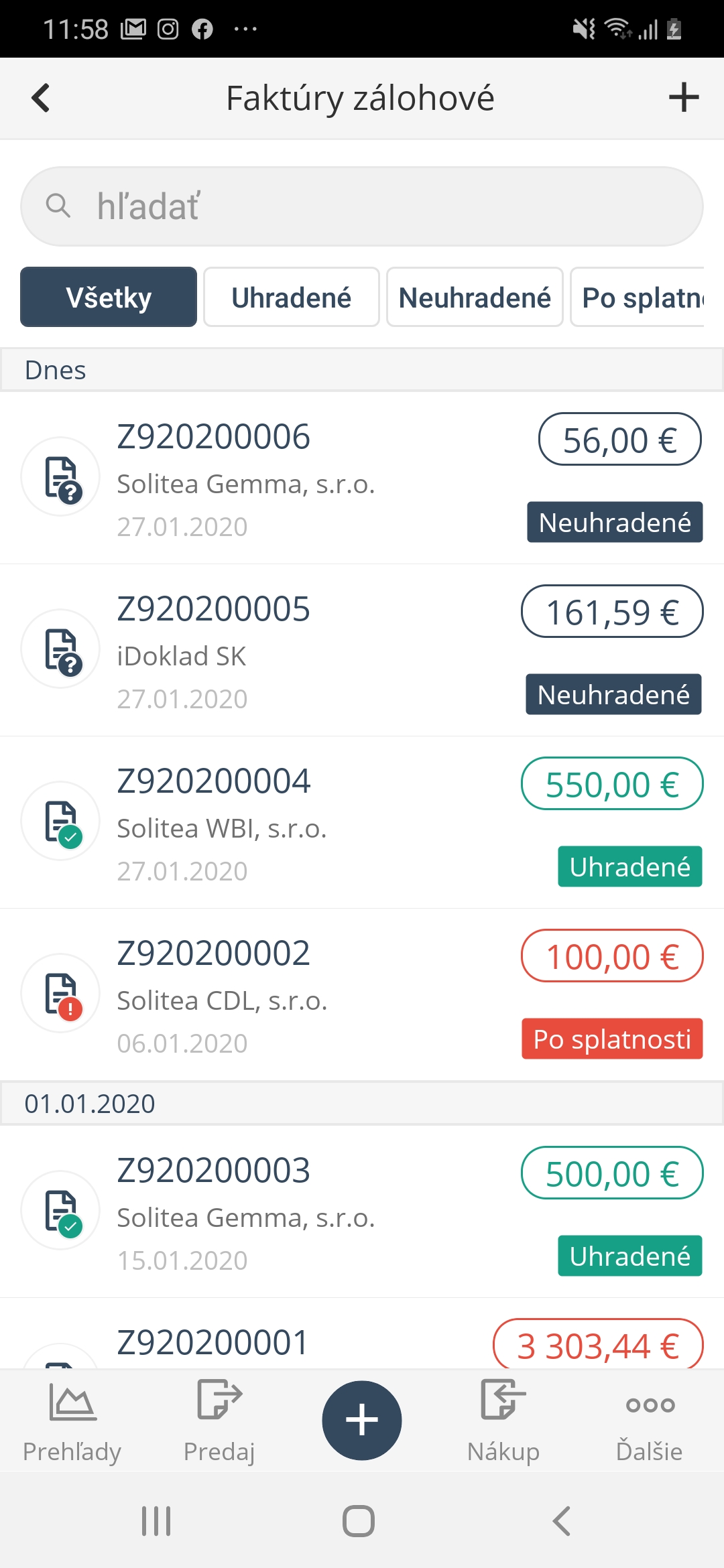 - filtrovanie (uhradené, neuhradené, po splatnosti),