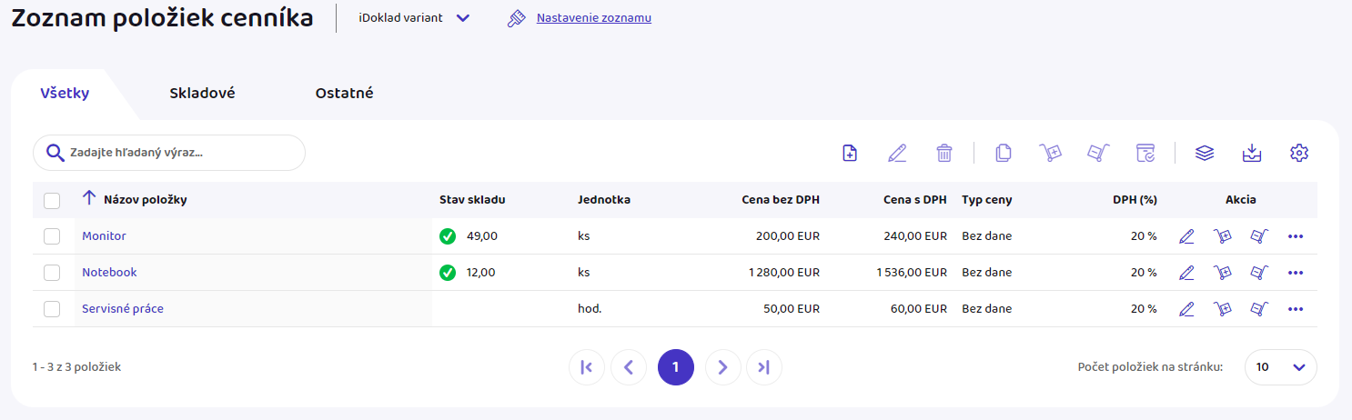 Zoznam položiek cenníka