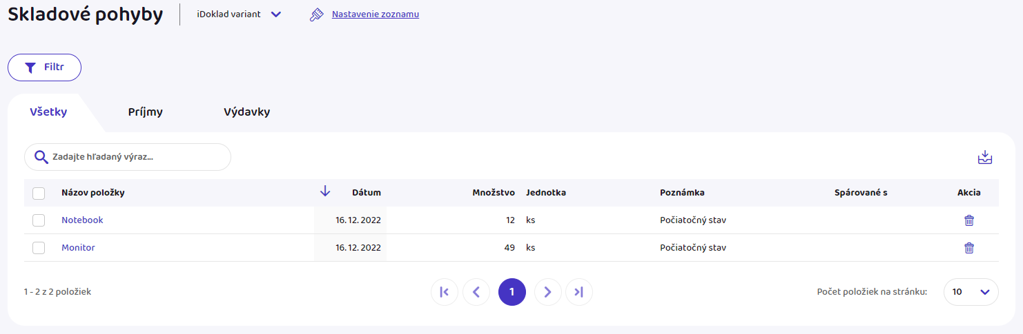 V karte skladové pohyby vidíte prehľad všetkých skladových pohybov na položkách.
