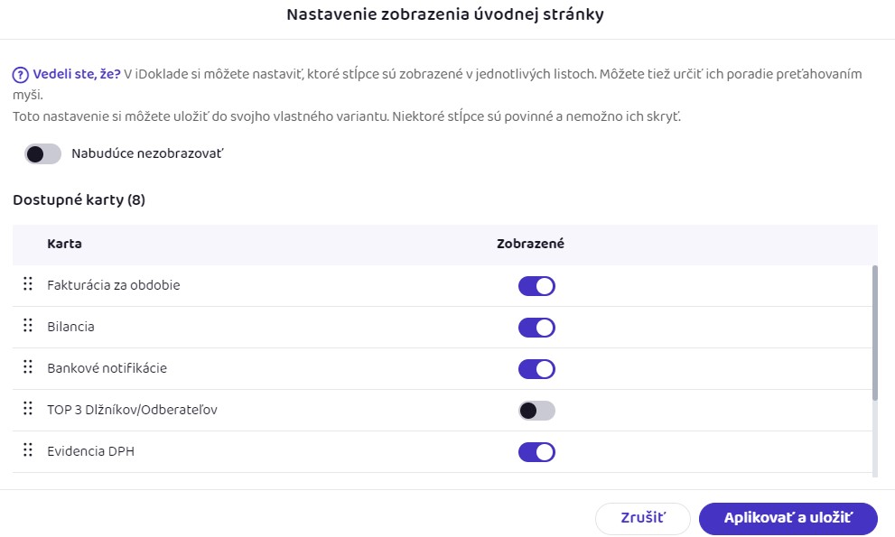 Nastavenie úvodnej stránky V iDoklade si môžete nastaviť, ktoré časti sú zobrazené v prehľade. Môžete tiež určiť ich poradie preťahovaním myši. Toto nastavenie si môžete uložiť do svojho vlastného variantu. Niektoré stĺpce sú povinné a nemožno ich skryť.